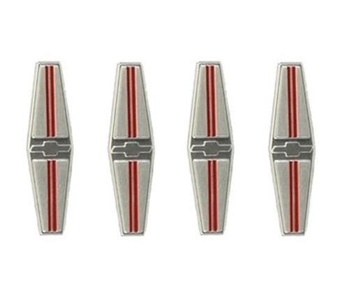 Correct emblem includes mounting tabs to be folded as original. Sold in set of 4. Correct backing plates available separately, or in 8 piece kit.